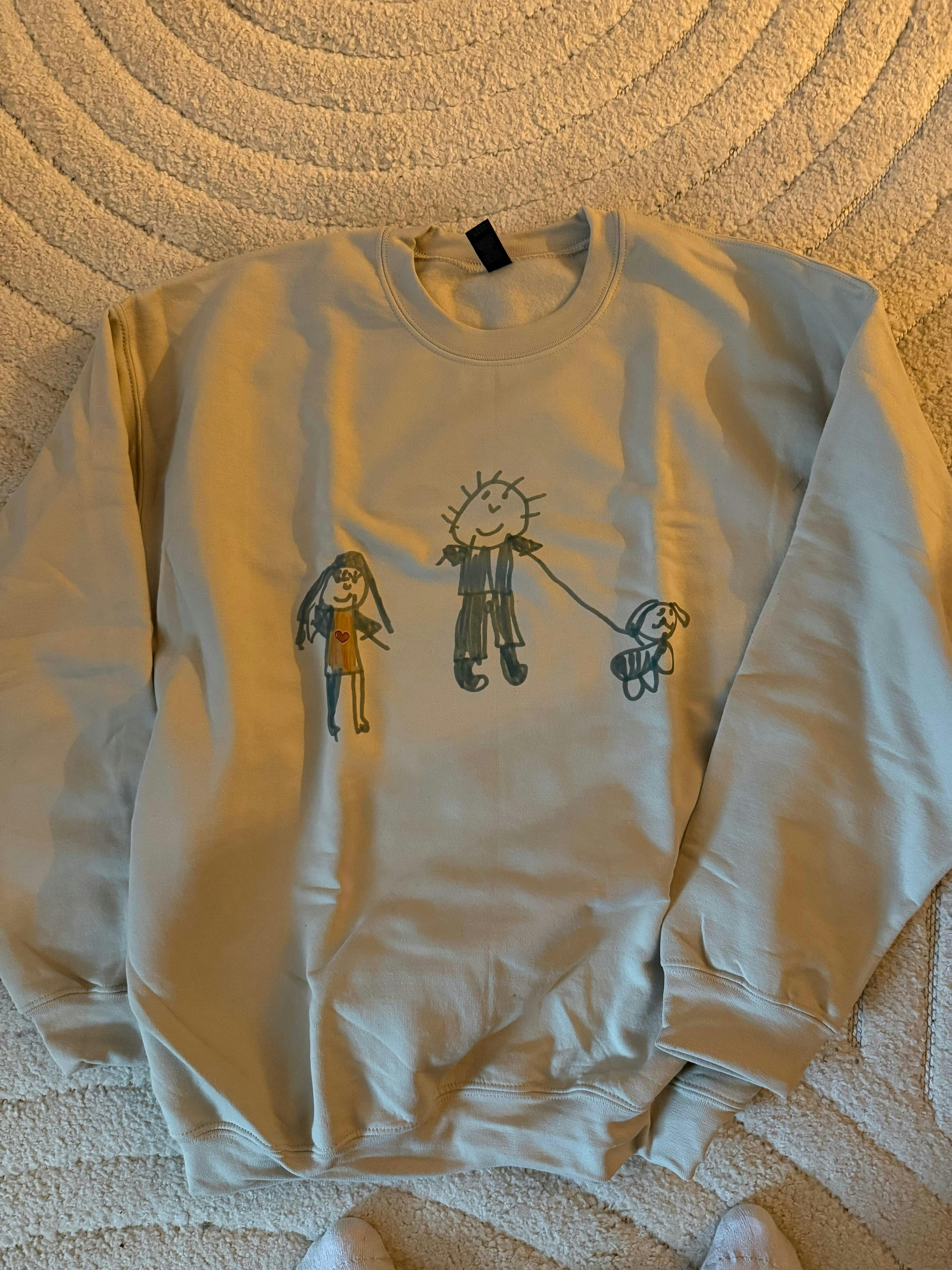 Collegepaita omalla piirroskuvalla kustomoituna on persoonallinen ja sydäntä lämmittävä vaate kenelle tahansa. Kustomoi oma paita esimerkiksi lapsen tekemällä piirrustuksella tai tekstillä.