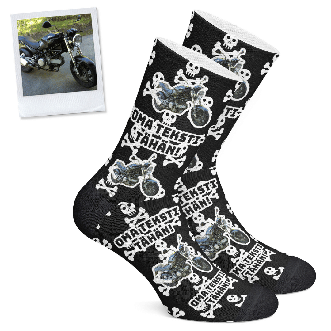 Voit laittaa sukkiin minkä tahansa kuvan; lapsi, koira, siili, moottoripyörä, mökki tai vaikka firman logo. Kaikki onnistuu! Lataa vain kuva, me hoidamme rajauksen ja suunnittelun. Jos haluat sukkiin enemmän kuin viisi eri kuvaa, ota meihin yhteyttä.