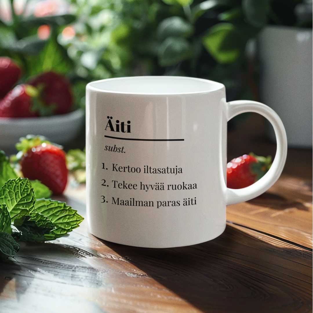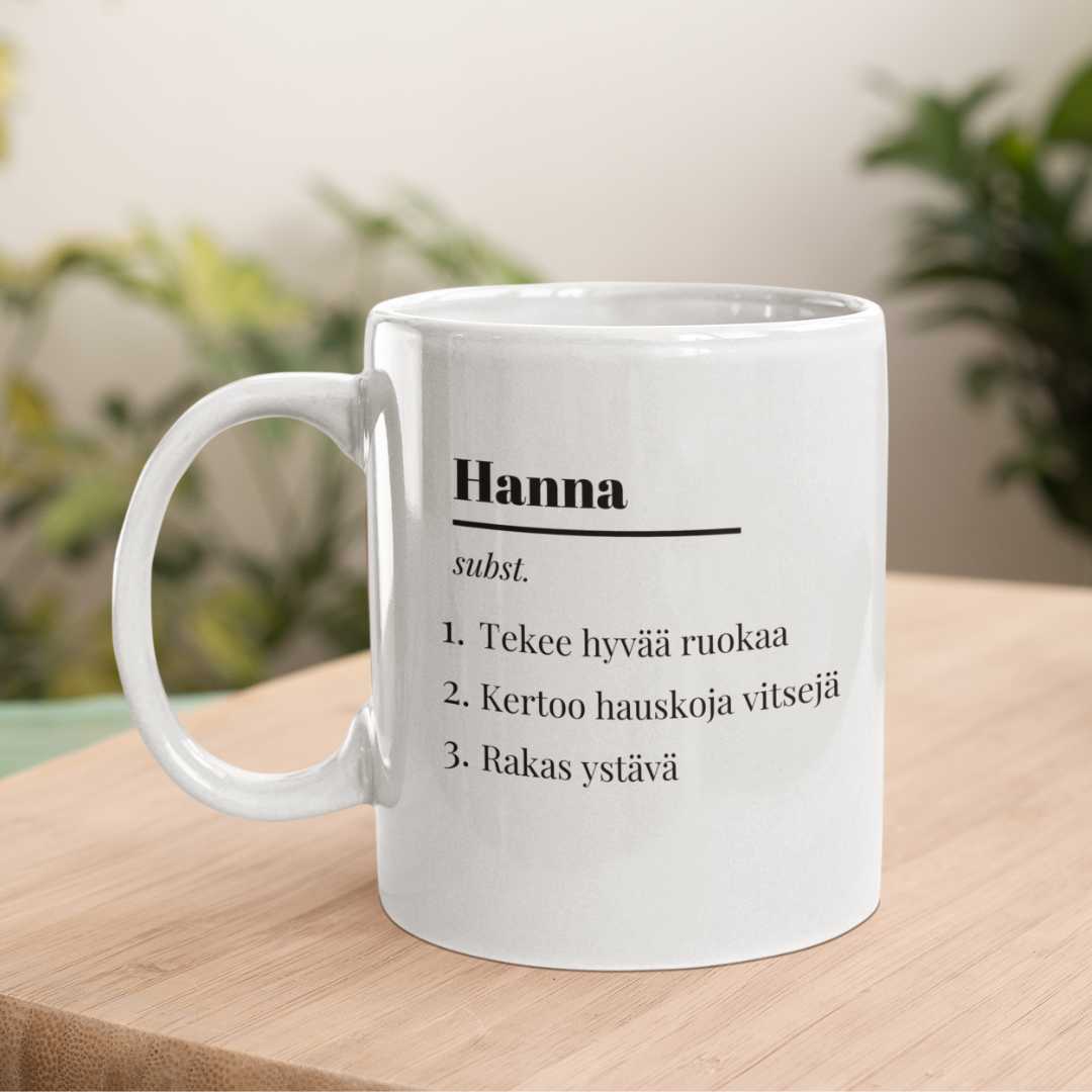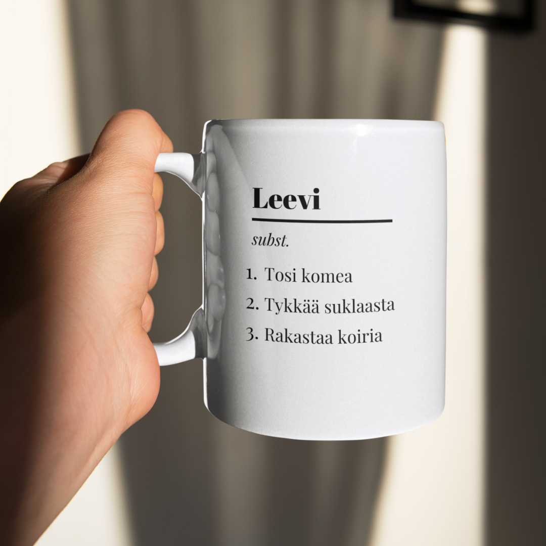 Muki omalla tekstillä on takuulla uniikki ja hyödyllinen lahjaidea kenelle tahansa! Voit personoida mukin lahjansaajan nimellä ja kolmella häntä kuvaavalla ominaisuudella. Anna muki lahjaksi esimerkiksi äidille, kaverille tai vaikkapa opettajalle. Kaiffari on pieni paja Äänekoskelta, jossa kustomoimme kaikki tuotteet käsin.